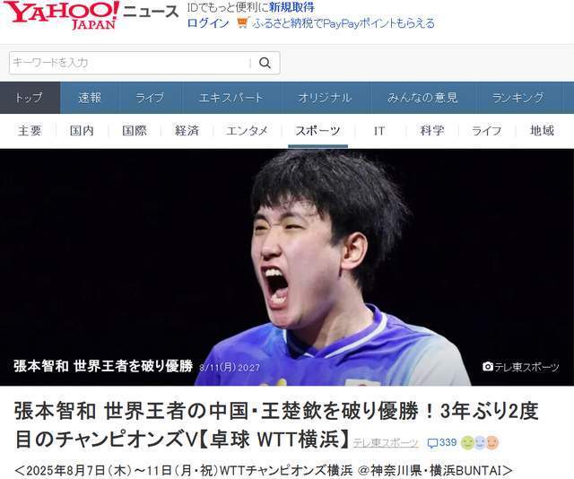 东道主名将张本智和在WTT横滨冠军赛4-2力挫世乒赛冠军王楚钦问鼎,这条炸裂性新闻马上登上日本雅虎体育版头条,张本俨然成为了日本乒乓球的民族英雄,日本网友对其极尽夸耀之能事,并且还不忘踩一下王楚钦。